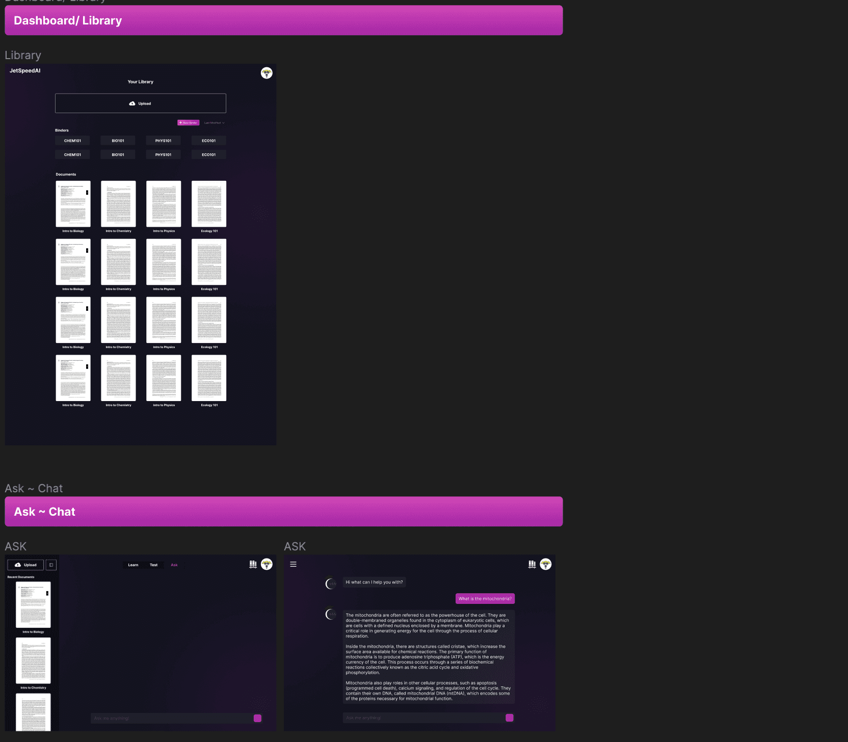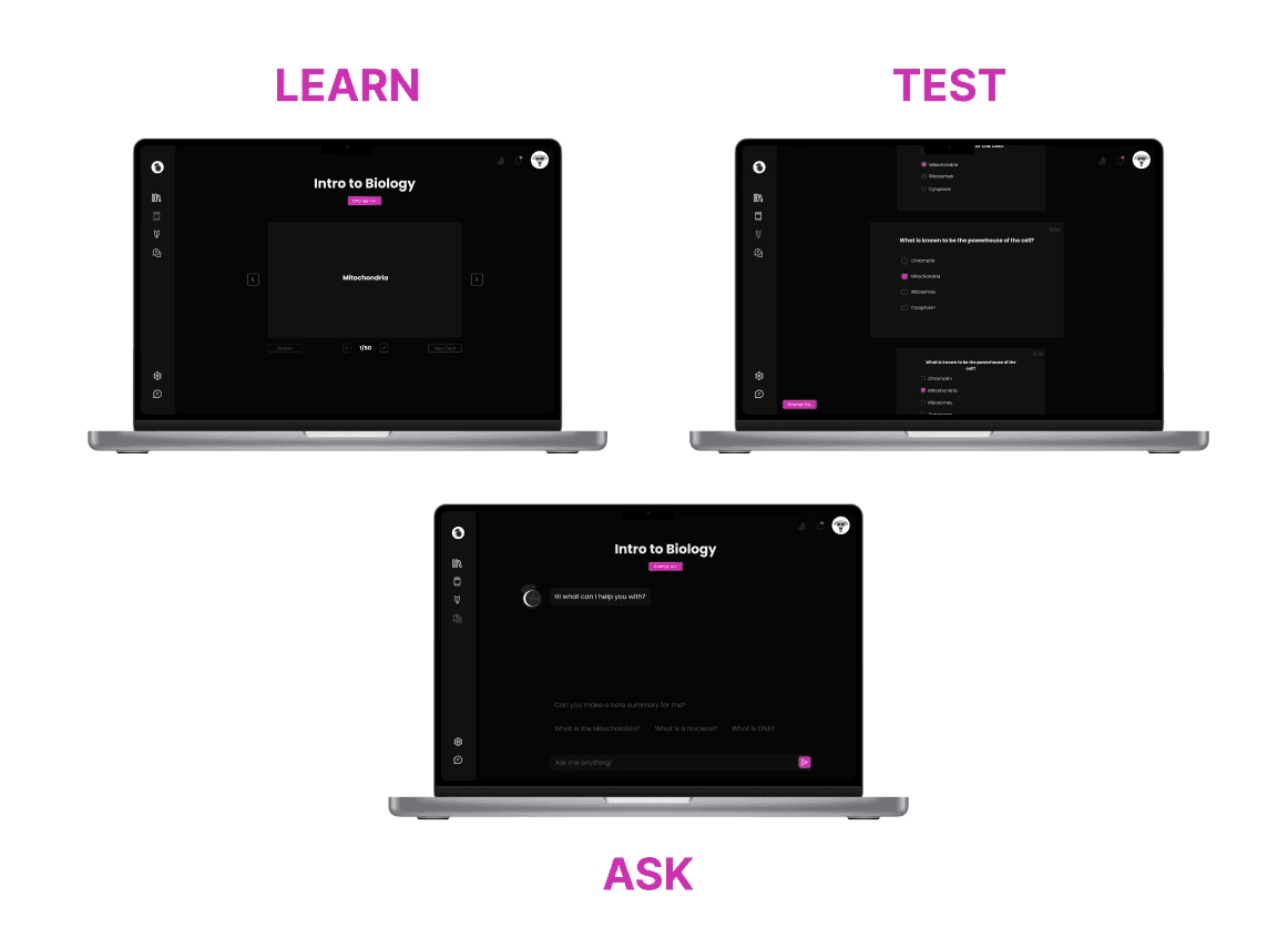 JetSpeed AI is a tool built for students, incorporating the use of AI into learning. By allowing users to ask questions, do practice quizzes and auto-generate flashcards based on their material learnt in class. It’s like having your teacher whenever you need!