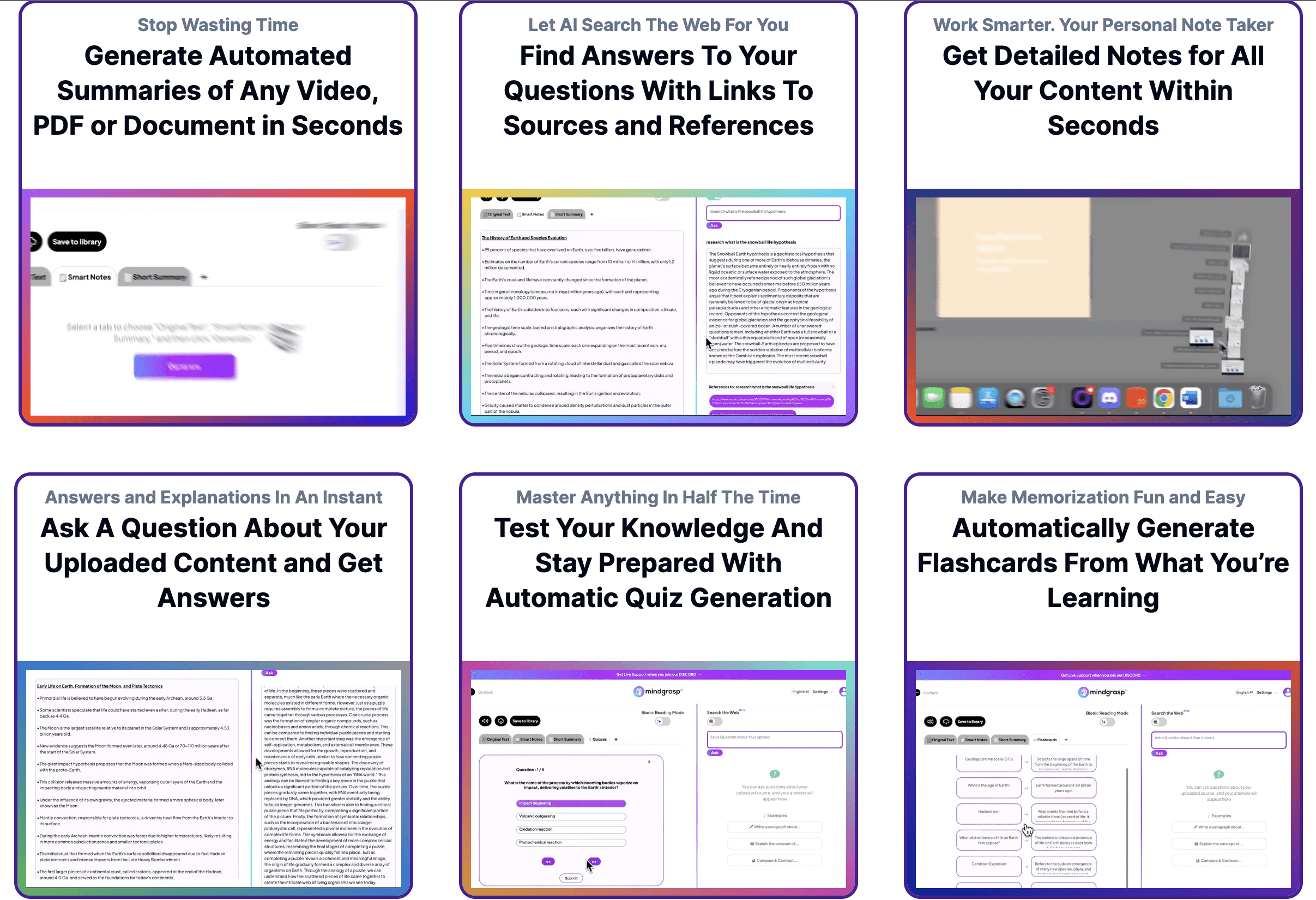 Mindgrasp.AI: focus on automated content summarization and detailed note generation from various types of media (videos, PDFs, documents), along with providing sourced answers.